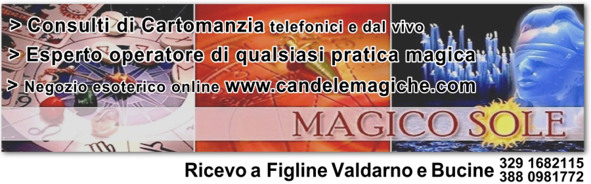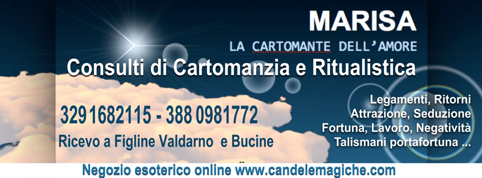- Cartomante consulti di cartomanzia dal vivo cell 3291682115 Sono Marisa la cartomante dell’amore con oltre trent’anni di esperienza. sono specializzata in legamenti incantesimi magia d’amore ma opero con successo qualsiasi genere di rituali magico. Ricevo dal vivo a Bucine (AR) e Figline Valdarno per info 3291682115 Per consulti telefonici visita il sito www.ritualiecartomanziadellamore.org (NO consulti gratuiti). Shop online www.candelemagiche.com