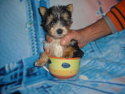 - cucciolo di yorkshire terrier toy!nato in italia con genitori visibili,mamma 1.8kg e papà 1.5kg!da adulto non supera il 1.5kg!Da vedere xk le foto non rendono la sua bellezza.Seguito sempre da veterinario ,ha libretto sanitario con certificato di vacinazioni.chiamatemi x qualsiasi informazioni.