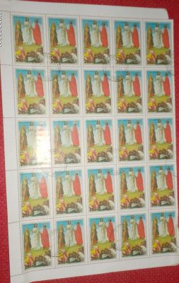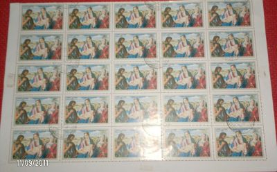 - N° 4 fogli per 15 francobolli emessi dalla Mongolia rappresentanti artisti Italiani. Bellini Transfigurazione,Lavergine Giovanni Battista e donna,Mantegna San Giorgio.€ 6