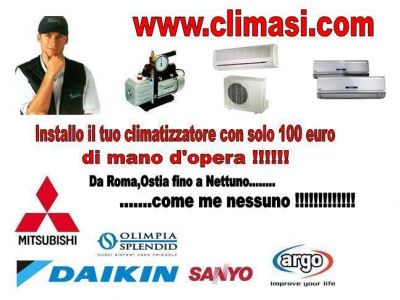 - WWW.MASSIMOSTECCONI.COM installo il tuo climatizzatore parete/parete con solo 100 euro di mano d'opera!!Sono serio e preparato.Mi reputo un professionista in questo campo.Uso sempre la pompa del vuoto!!!Se vuoi sapere tutto sul mio lavoro e , soprattutto le mie tariffe, guarda il mio portale e scopri come è facile fare un buon lavoro e risparmiare denaro!.......dimenticavo riparo pure i danni causati da installatori improvvisati ed estivi.Da Roma,Ostia fino a Nettuno come me nessuno!!! Un saluto Massimo Stecconi.com