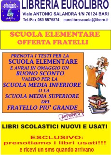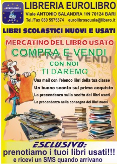 - la LIBRERIA EUROLIBRO è LIBRERIA SCOLASTICA, fornisce gratis l' elenco dei libri scolastici di tutte le scuole e, oltre a fornire tempestivamente i libri nuovi promuove un mercatino dei LIBRI SCOLASTICI USATI. Nel MERCATINO dei libri scolastici usati puoi trovare i libri scolastici che ti servono e vendere i libri scolastici che non adoperi più. la LIBRERIA EUROLIBRO è specializzata nella fornitura di libri per la scuola materna, scuola elementare, scuola media e università. Nella LIBRERIA EUROLIBRO è possibile trovare tutte le novità editoriali dei maggiori editori e ha un intero settore dedicato ai libri per bambini e ragazzi. La LIBRERIA EUROLIBRO è un punto di riferimento per quanti dovendo partecipare ai vari CONCORSI hanno bisogno di trovare i libri necessari per la PREPARAZIONE AL CONCORSO. la EUROLIBRO è anche una LIBRERIA specializzata nel settore religioso distribuendo gli editori ELLEDICI, SAN PAOLO, DEHONIANE, MESSAGGERO