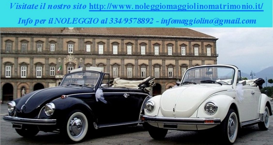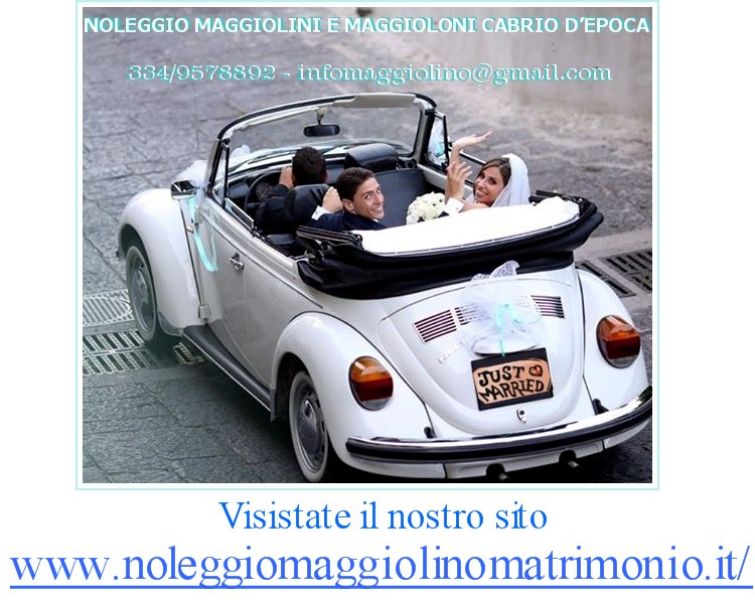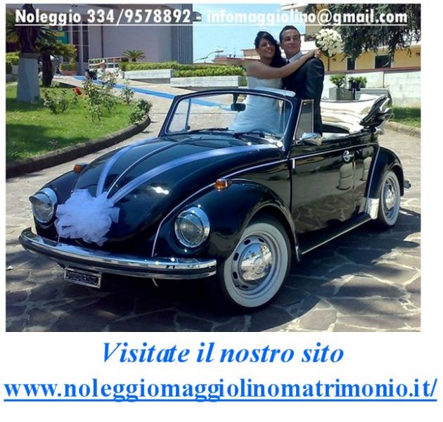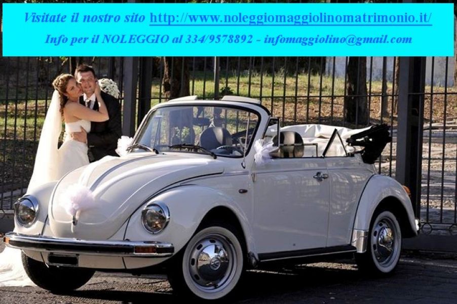 - Noleggio Maggiolone e Maggiolino cabrio d’epoca trasforma i momenti più importanti della vostra vita in un evento da vivere in tutta la sua magia. Un servizio prestigioso nato per esaudire i vostri desideri con professionalità e competenza. L’auto sarà addobbata, secondo le vostre richieste, in modo da farne risaltare maggiormente l'eleganza e il prestigio. La macchina resterà a vostra completa disposizione in funzione del servizio prescelto. Vi consigliamo di visionare le auto dal vivo per stimarne l’originalità, l’eleganza e fare la differenza. Non fidatevi delle auto mostrate solo nel web o in brochure … Per altri dettagli visitate il nostro sito www.noleggiomaggiolinomatrimonio.it Per pianificare insieme il noleggio non esitate a contattarci al 334.9578892 - infomaggiolino@gmail.com. Siamo presenti anche su: www.facebook.com/noleggiomaggiolone