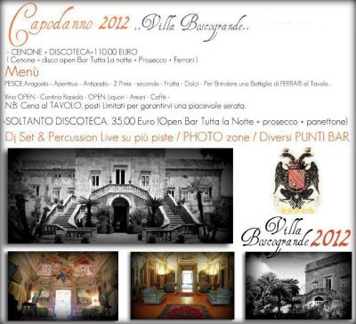 - CAPODANNO 2012 : VILLA BOSCOGRANDE -> OPENBAR Siamo lieti di invitarvi nella storica ed incantevole location di Villa Boscogrande, per dare il benvenuto al nuovo anno con un party all'altezza dell'occasione... all'interno di questa splendida cornice si svolgerà il party CURATO IN OGNI MINIMO DETTAGLIO... ----------------------------------------------------------------------------------------- - CENONE + DISCOTECA 110,00 EURO ( Cenone + disco open Bar Tutta La notte + Prosecco + Ferrari ) - DISCOTECA 35,00 Euro (Open Bar Tutta la Notte + prosecco + panettone) --------------------------------------------------------------------------------------- 5 DEEJAY'S JERRY GALATIOTO - GURRERA - TIRENNA - GIUCASTRO - DI GANCI LIVE PHOTO ZONE by Alessio Di Grande VARIE PISTE con diversi Dj Set.. Tanti punti BAR per rendere fluido l'openbar - VI CONSIGLIAMO DI PRENOTARE IL PRIMA POSSIBILE - Info e prenot. DANILO PENSABENE 393 5554400 - 327 0284110