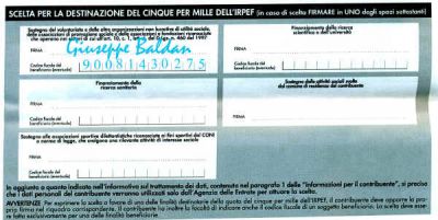 - Nel mese di maggio 2011 alcune categorie di contribuenti sono tenuti a presentare i modelli CUD, 730, Unico. Quest’anno dona e fai donare ai tuoi parenti e amici il 5x1000 a Legambiente Circolo Riviera del Brenta. La nostra associazione ha ottenuto l’importante riconoscimento O.n.l.u.s. (organizzazione non lucrativa di utilità sociale) che viene rilasciato solo alle organizzazioni di volontariato più attive in ambito sociale e che rispettano rigorose regole di trasparenza di bilancio e di gestione. Cerca nel modulo Modello Unico, 730, CUD lo spazio: “Scelta per la destinazione del 5 x 1000” Metti la tua firma nel riquadro “Sostegno del volontariato e delle altre organizzazioni non lucrative di utilità sociale, etc.” Sotto la firma, nello spazio “codice fiscale del beneficiario” inserisci il codice fiscale di Legambiente Circolo Riviera del Brenta: 90081430275.