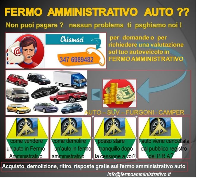 - Aiuto gratis al fermo amministrativo dell’auto. Acquistiamo la vostra auto o veicolo in preavviso di fermo amministrativo, o già gravato da fermo amministrativo. Ottime valutazioni e pagamento immediato. Hai scoperto che sulla tua auto grava un fermo amministrativo Equitalia o di altro Ente? hai ricevuto un preavviso di fermo amministrativo riferito a un tuo autoveicolo? Sei nel panico totale e nessuno ti fornisce delle risposte concrete contattaci al 347 6989482 Risponderemo gratis alle tue domande, tipo: Ora che faccio con un fermo amministrativo sull’auto? Posso circolare con la mia auto in fermo amministrativo? Quali problemi vado a incorrere se circolo o non pago il fermo amministrativo sulla mia auto? Come faccio a sapere quale importo devo pagare in relazione al mio fermo amministrativo? Chi è l’Ente preposto a riscuotere la somma del mio fermo amministrativo? Etc. etc. Chiamami!!!