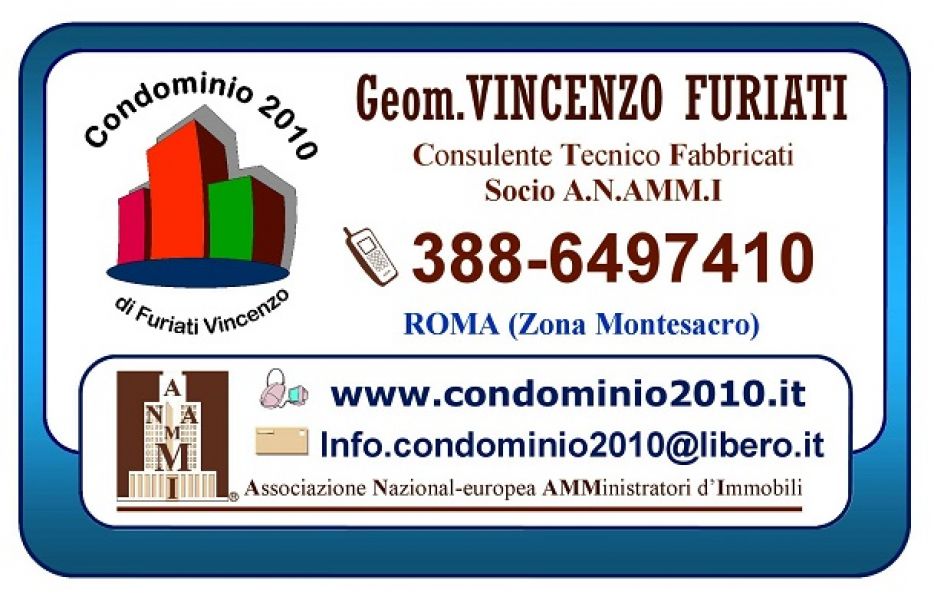 - Il vecchio amministratore non ti convince più? E' tempo di cambiarlo. Non esitare, un'amministrazione poco chiara produce danni incalcolabili. Noi ti offriamo una gestione chiara e trasparente, innovativa, flessibile e dinamica. Nel rispetto delle leggi vigenti ci avvaliamo di moderni mezzi tecnologici sempre aggiornati che ti permettono di risparmiare. In tempi di crisi la nostra esperienza pluriennale è la risposta migliore che ti puoi dare. Visita senza indugio il nostro Sito Web: www.condominio2010.it oppure scrivi all'indirizzo E-Mail: info@condominio2010.it o contattaci al numero Cell.388 6497410. La prima consulenza è sempre gratuita nel tuo condominio anche collettiva e con rappresentanza alla prima assemblea