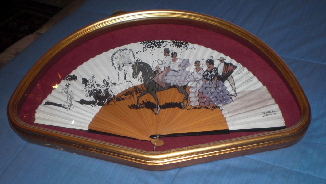 - Antico ventaglio dipinto a mano anni '50, in cornice dorata Ventaglio anni '50 dipinto a mano con firma in basso a destra 'Rubio Sevilla'. Il ventaglio è racchiuso in una cornice di legno dorata con vetro, appositamente creata ad arte 'ventagliera'. La cornice è dotata di apposito gancio per poter essere facilmente appesa al muro. Dimensioni della teca con vetro nei punti più alti e lunghi cm. 62X38, profondità cm. 5. STATO DI CONSERVAZIONE OTTIMO COME MOSTRANO LE FOTOGRAFIE Spese di spedizione euro 10,00 con posta PACCO ORDINARIO 'sicuro e tracciabile', opportunamente protetto in custodia di cellofan e inviata dentro apposita pacco postale imbottito a bolle d'aria. pagamento: postepay bonifico bancario vaglia postale