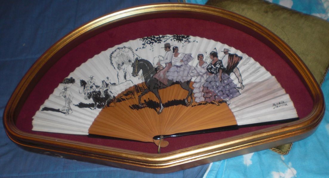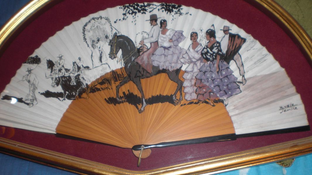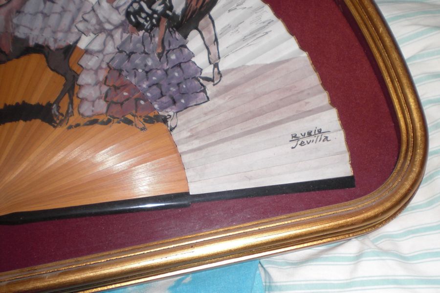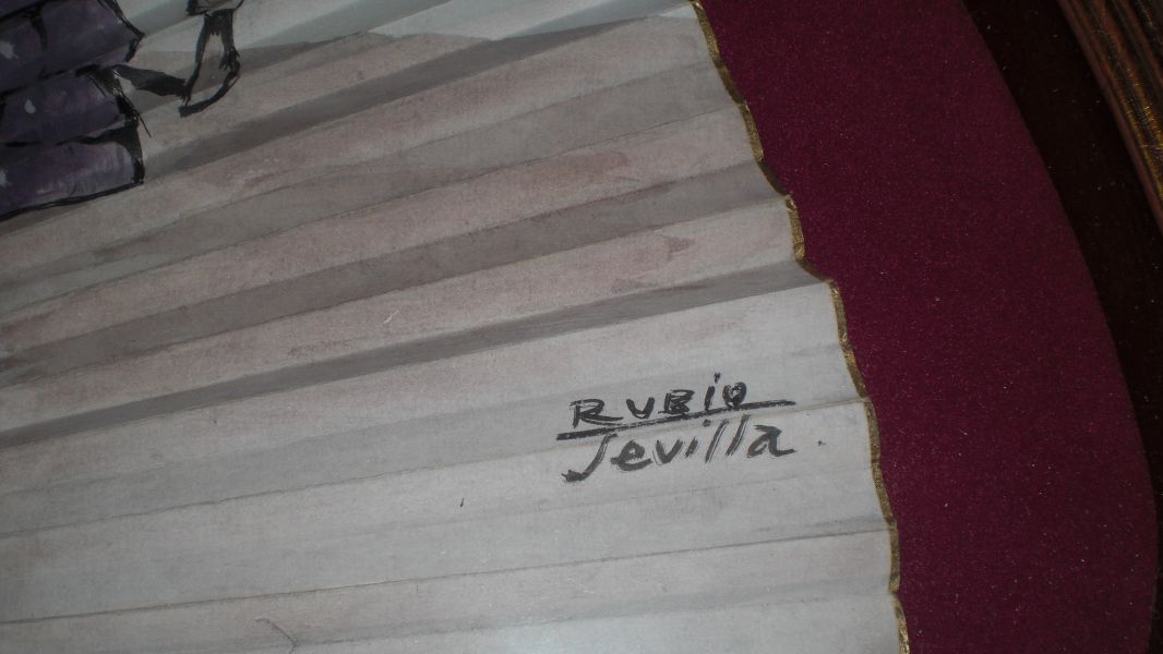 Antico ventaglio dipinto a mano anni '50, firma 'Rubio Sivilla'.