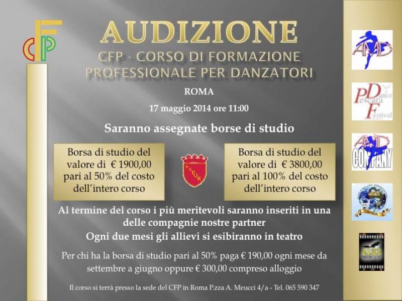 - AUDIZIONE 17 MAGGIO 2014 ROMA Il 17 Maggio 2014 il WBA (World Ballet Association) presso l'AMD Mondial Dance (Piazza Antonio Meucci 4a) alle ore 10:00 organizza anche quest'anno le audizioni per il Corso Di Formazione Professionale per danzatori. Durante l'audizione, i migliori selezionati, avranno diritto ad una Borsa Di Studio pari al 50% del costo dell'intero corso. Il corso è della durata di un anno e prevede all'incirca un totale di 20 ore settimanali. Si richiede una buona base tecnica, astenersi principianti. Per maggiori informazioni contattare lo 06 5590347 oppure inviare una mail a worldballetassociation@gmail.com Vi ricordiamo che per accedere all'audizione è necessario prenotarsi inviando il proprio curriculum artistico.