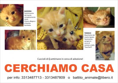 - 2 splendidi micetti teneroni e giocherelloni di 6 settimane, cercano adozione! Buddina: manto rosso, è una splendida femminuccia un pò timida, ma tutto pepe e coccole. Cerca continuamente attenzioni, adora le carezze sotto il mento e ama deliziarci con i suoi agguati goffi e divertenti. Per chi non lo sapesse, una femminuccia completamente rossa è una vera rarità! Terence: tenero maschietto tartarugato, dal particolare pelo con venature rossiccie. è un maschietto mammone, ma con la sorellina si diletta in lotte da resling. Cercano casa possibilmente insieme in puglia, ma non escludiamo proposte fuori puglia se adottati in appartamento (no piano terra o piano romano) con 1gatto adulto. Ovviamente, si richiedono autorizzazioni a controlli pre e post affido+modulo e sterilizzazione obbligatoria. per info: francesca t.3313487713 t.3313487809 battito_animale@libero.it