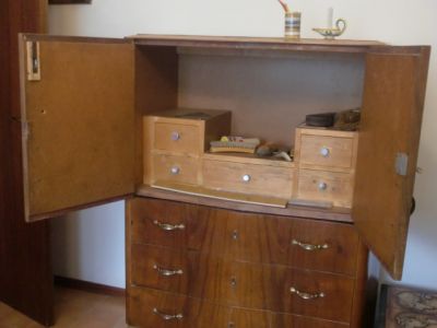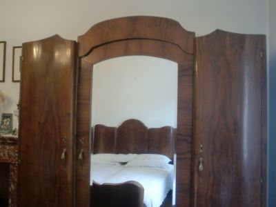 - CAMERA DA LETTO MATRIM. Anni '20-'30 in legno tamburato, impialliciato in noce, con tutti i mobili in stile bombato e mosso: LETTO A 2 PIAZZE; 2 COMODINI piede a prosciutto; COMÒ con specchiera; ARMADIO con merlatura superiore e grande specchio centrale; ARMADIETTO con 3 cassetti e 2 ante racchiudenti scomparto e cassettini. Vendesi 0546/54608; altieril@libero.it