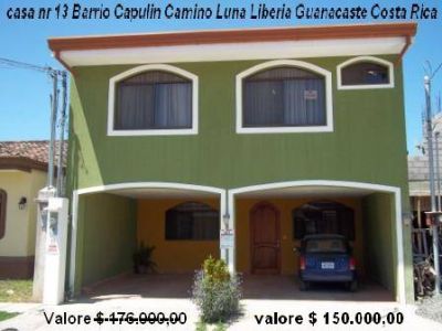 - Casa mq 199 su 2 piani Lotto mq 188 5 camere da letto 3 bagni Ingresso living 1 cucina Sala pranzo Lavanderia Giardino interno Garage per 2 macchine Aria condizionata + ventilatori a soffitto Valore $ 176.000,00 ribassato a $ 150.000,00 Interessante investimento da approfittare in questo memento particolare di mercato, la casa si affitta prontamente ad almeno $ 1000,00 al mese, essendo collocata nel Residencial Camino Luna – Liberia – Costa Rica Un residenziale a solo 2 minuti dal centro di Liberia, nelle vicinanze di moltissimi centri commerciali e supermercati,Ospedali, Cliniche private, uffici municipali, solo 20 minuti dalle spiagge. Un residenziale con guardia privata 24 ore su 24 tutto l’anno, tutte le casa con giardino privato e parco giochi per i bambini. http://vendocasecostarica.jimdo.com email: 2011realidad@gmail.com 00506 -83498878 – 00506 -87221592