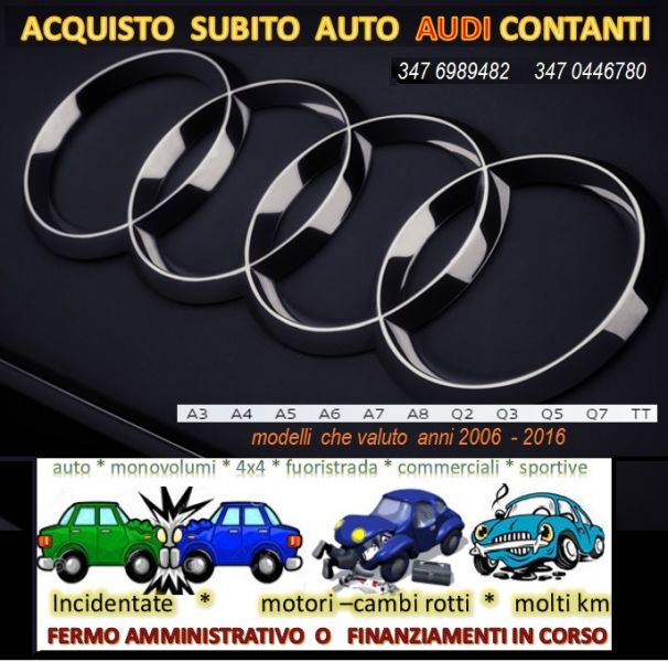 - Acquisto Automobili Audi incidentate, sinistrate anche fortemente, degli anni 2005 - 2016. Ottime valutazioni riferite a un pagamento immediato. Compriamo anche se da radiare, Audi con motori fusi, o cambi non funzionanti. Compriamo anche se gravati da problemi di fermo amministrativo, o fallimentare. Contattateci per la vendita della vostra Audi usata, rotta o con qualsiasi problema, noi la compriamo. 347 6989482 anche WhatsApp
