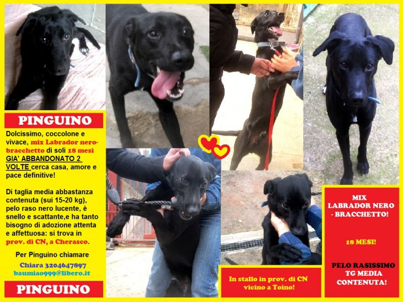 - Dolcissimo, coccolonissimo e vivace mix Labrador nero-bracchetto di soli 18 mesi cerca casina! Pinguino ha già subito 2 importanti abbandoni, il primo perché, preso da cucciolo, è cresciuto più di quanto doveva, il secondo perché, ormai cucciolone, non c’era alcuna voglia di occuparsi di lui, delle sue richieste di affetto e attenzione e della sua vivace indisciplina. Pinguino è un cucciolone dinoccolato, taglia media abbastanza contenuta (sui 15-20 kg) giocherellone e molto vivace, bisognoso di corse, sfogo, coccole e guida sicure! E’ a pelo rasissimo nero lucente, è snello e scattante, e ha davvero tanto bisogno di adozione attenta e affettuosa: si trova in prov. di CN, a Cherasco, in stallo, per buona adozione va in tutto il Nord e centro Italia! Per lui chiamare Chiara 3204647897 mail baumiao999@libero.it, A DISPOSIZIONE SUO BELLISSIMO VIDEO!