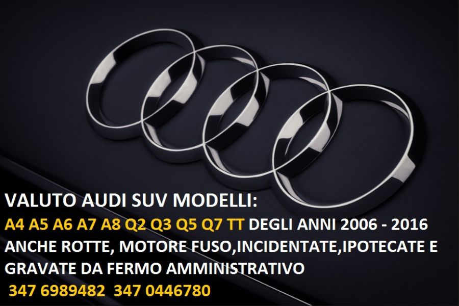 - Quotiamo Audi fuoristrada o Mercedes 4x4, compriamo con ottime valutazioni Audi 7 posti diesel o benzina, anche se sono con molti km. Audi fuoristrada o suv incidentati rotti o vincolati da fermo amministrativo o finanziamento in corso, noi compriamo tutti i 4x4 Audi degli anni 2005-2016 contanti. 347 6989482 347 0446780