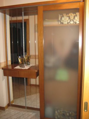 • Graziosa consolle in legno parete specchio + anta in vetro scorrevole per vano cappotti larghezza 1.56cm, h 2.05cm, profondità 33cm vendo causa trasferimento Euro 250