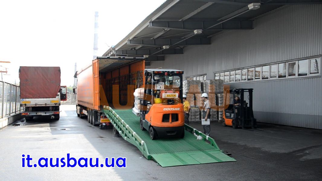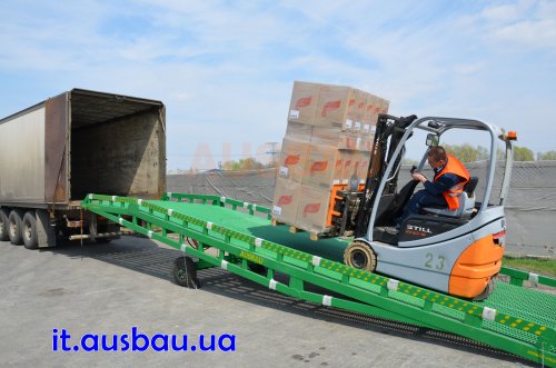- Container rampa cassa mobile Ausbau. Portata di 6000, 8000 e 10000 kg. Altezza regolabile idraulicamente (da 90 a 165 cm), grande piattaforma. Un notevole risparmio di tempo per lo scarico / carico + ridotta intensità di lavoro (scarico / carico può essere fatta solo dal conducente del carrello elevatore). Più informazioni Container rampa cassa mobile sul sito web it2.av-exim.com Recapiti a Kiev (Ucraina): T +38O-44-599-3OI5 M +38O-5O-544-584O http://it2.av-exim.com FUNZIONAMENTO Container rampa cassa mobile: Il carrello elevatore solleva un bordo della rampa e la addossa contro il camion / vagone. Un uomo premendo sulla maniglia della pompa idrostatica fissa l'altezza desiderata della rampa (min. 90 cm., max. 165 cm.). In seguito la rampa viene fissata con due catene al camion, le ruote si bloccano con freni (forniti in dotazione alla rampa), poi il carrello elevatore entra con il carico sulla superficie della rampa all'interno del camion o del vagone.