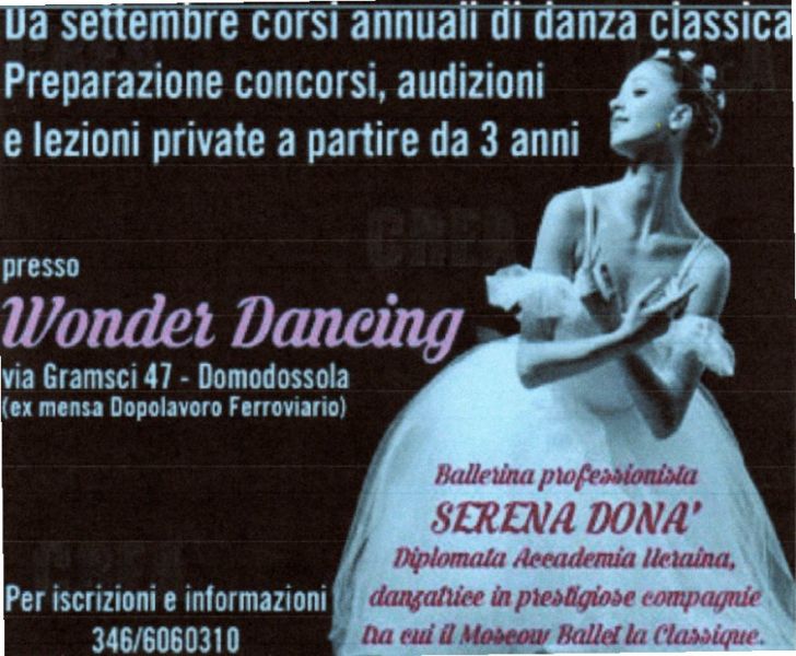 - Da settembre corsi annuali di danza classica Metodo Vaganova, preparazione concorsi, audizioni e lezioni private a partire da 3 anni, presso ' WONDER DANCING ' via Gramsci 47 Domodossola. Ballerina professionista SERENA DONA', Diplomata Accademia Ucraina,danzatrice in prestigiose compagnie tra cui il MOSCOW BALLET LA CLASSIQUE - Mosca per iscrizioni e informazioni, 3466060310