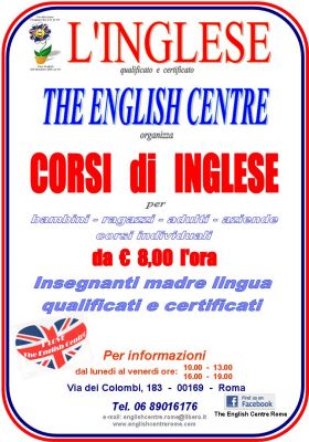 - THE ENGLISH CENTRE, Examination Centre di Trinity College London e sede di esami internazionali, offre una ampia varietà di corsi di lingua Inglese tenuti da insegnanti ESCLUSIVAMENTE madre lingua qualificati, certificati e specializzati nell’insegnamento della lingua Inglese come seconda lingua. Offriamo corsi: - per Aziende; - per bambini, ragazzi ed adulti; - Business, Financial e Legal English; - E.S.P. (Inglese per scopi specifici); - di gruppo; - individuali; - a domicilio. Il nostro Centro di Lingue Straniere è situato a Roma in Via dei Colombi n° 183 (Torre Maura), nelle immediate vicinanze del Policlinico Casilino. Per informazioni: - telefonare al n° 06 89016176 dal lunedì al venerdì dalle ore 10.00 alle ore 13.00 e dalle ore 16.00 alle ore 20.00; - email: englishcentre.rome@libero.it;