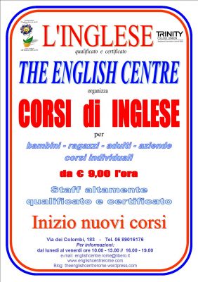- THE ENGLISH CENTRE, Examination Centre di Trinity College London al n° 41828 e sede di esami internazionali, offre una ampia varietà di corsi di lingua Inglese tenuti da insegnanti ESCLUSIVAMENTE madre lingua qualificati, certificati e specializzati nell’insegnamento della lingua Inglese come seconda lingua. Offriamo corsi: - intensivi per perfezionamento e / o consolidamento della lingua Inglese; - intensivi per recupero debito scolastico; - per Aziende; - per bambini, ragazzi ed adulti; - Business, Financial e Legal English; - E.S.P. (Inglese per scopi specifici); - di gruppo; - individuali; - a domicilio; - corsi di Francese; - Corsi di Spagnolo; - Corsi di Tedesco. Il nostro Centro di Lingue Straniere è situato a Roma in Via dei Colombi n° 183 (Torre Maura), nelle immediate vicinanze del Policlinico Casilino. Per informazioni: - telefonare al n° 06 89016176 dal lunedì al venerdì dalle ore 10.00 alle ore 13.00 e dalle ore 16.00 alle ore 19.00; - email: englishcentre.rome@libero.it