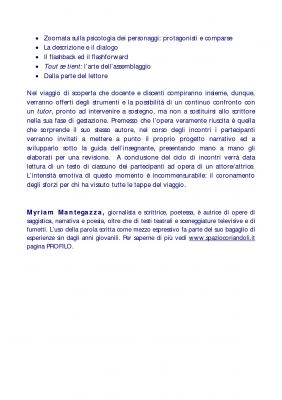 - LA ROAD MAP DEL ROMANZO DALLA NASCITA DELL’IDEA ALLA PAGINA SCRITTA 10 incontri con Myriam Mantegazza Il percorso da compiere dalla nascita dell’idea alla pagina scritta, superando il panico del foglio bianco ed acquisendo efficaci escamotage per arrivare al traguardo, definire la storia, tratteggiare la psicologia dei personaggi, conferire ritmo alla narrazione, dare corpo a un sogno. MYRIAM MANTEGAZZA, giornalista e scrittrice, è autrice di romanzi storici, racconti, fiabe per bambini DOVE: I CORIANDOLI – Spazio per tuttologi e creativi Milano - Piazzale Loreto INFO: 334 8461841 – 339 5461894 WEB:www.spaziocoriandoli.it MAIL: spazio.coriandoli@libero.it FB: http://www.facebook.com/SpazioICoriandoli I Coriandoli – Spazio per tuttologi e creativi è disponibile anche come sala prove o come sede dei vostri corsi, stage, laboratori teatrali, riunioni, eventi.
