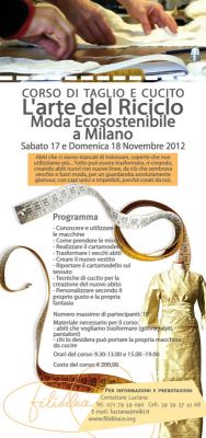 - Da Sabato 17 a Domenica 18 Novembre 2012 Possibilità di partecipazione anche ad un solo giorno dalle ore 9,30 alle ore 13,30 - dalle ore 14,30 alle ore 19,00 é possibile anche partecipare ad una sola giornata Sede e data del corso Numero massimo di partecipanti: 10 Costo totale del corso € 200 È possibile partecipare anche ad un solo giorno, il costo è di € 100 Abiti, cappotti che ci siamo stancati di indossare; coperte che non utilizziamo più; pantaloni che sono rovinati solo in alcuni punti e forse potrebbero aver esaurito la loro funzione, nonostante la buona qualità del tessuto. Tutto può essere trasformato, ri-creando, creando abiti nuovi con nuove linee, da ciò che sembrava vecchio e fuori moda. Il risultato sarà un guardaroba assolutamente glamour, con capi unici e irripetibili, perché creati da noi. A chi si rivolge A tutti coloro che vogliono entrare nel mondo del cucito, della creatività e dell'ecocons