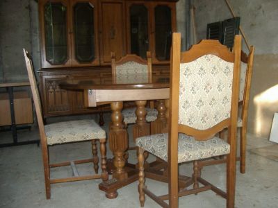credenza con vetrinetta in noce, più tavolo allungabile e sei sedie in noce massiccio