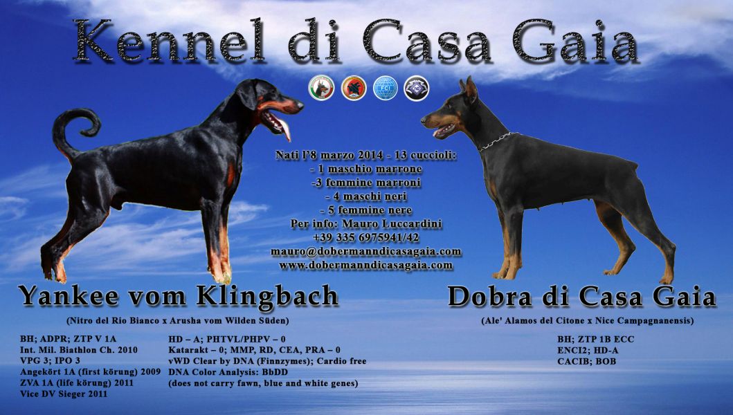 - Cucciolata prestigiosa nati il 8 Marzo 2014 (5 maschi e 9 femmine, marroni e neri): Padre – Yankee Vom Klingbach Madre – Dobra di Casa Gaia Solo per amanti animali e appassionati razza. Selezionati per competizioni di bellezza e lavoro. Si accettano prenotazioni. Contatti disponibili : Mauro +39 335 6975941 (dopo le ore 18,00) oppure Maite +39 335 6975942 Web: www.dobermanndicasagaia.com Email : mauro@dobermanndicasagaia.com Skype : mauroluccardini