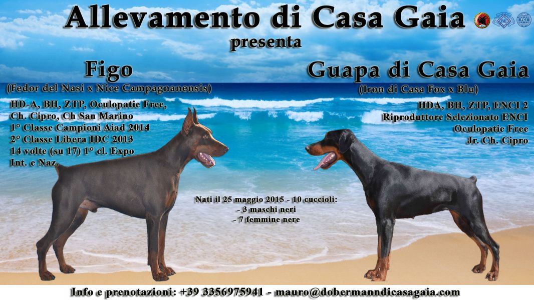 - Nuova cucciolata Allevamento Dobermann di Casa Gaia - nata il 25 maggio 2015 Lettera K Padre : Figo 'di Casa Gaia' (Fedor del Nasi x Nice di Campagna Nensis) - 1 Classe Campioni Camionato Aiad 2014 - 2 Classe Libera IDC 2013 - Campione Estero - 14 primo classificato su 17 expo nazionali ed internazionali. BH , ZTP , HDA , oculofree Madre : Guapa di Casa Gaia : (Iron di Casa Fox x Blu) Riproduttrice selezionata - Camp. Junior Cipro e San Marino 2012 - BH, ZTP, Enci , HDA , oculofree Per ulteriori informazioni contattare : mauro@dobermanndicasagaia.com oppure dopo le ore 18,00 : 335 6975941 / 2 - Mauro o Maite