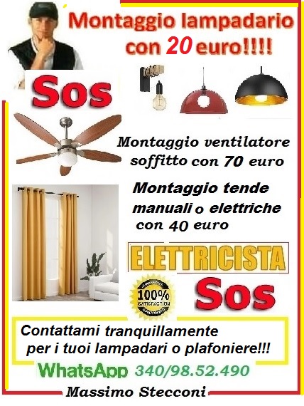 - Sono un bravo elettricista a tua disposizione per il montaggio dei tuoi nuovi lampadari!!! Il mio onorario è di 20 euro per lampadario. Con me non ci sono sorprese!!!!sai subito quanto andrai a spendere. Sono disponibile a domicilio per la tua riparazione elettrica. Tra le tante cose che faccio eseguo installazione di lampadari, applique, plafoniere, faretti led e strisce led. Ottimo installatore di ventilatori a soffitto. Sono serio, affidabile e riservato. Contattami tranquillamente su whatsapp per ogni tua domanda o conferma prezzi. Mi Muovo su tutta Roma. Se bene vuoi fare........ è me che devi chiamare!!!! Massimo stecconi elettricista