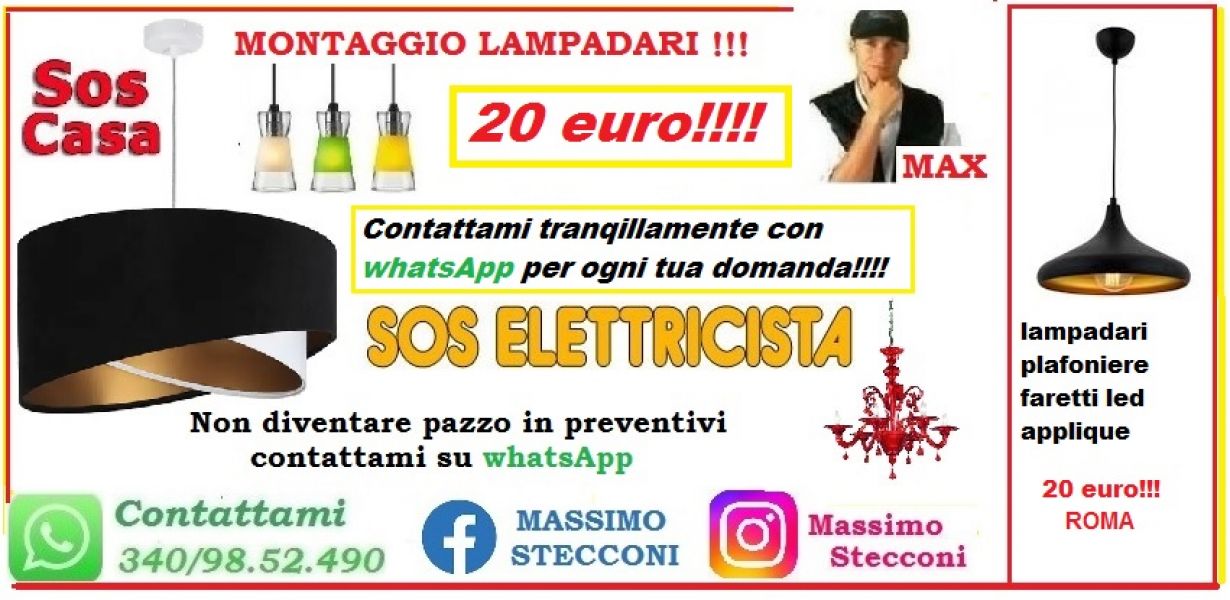 - Buongiorno, sono un bravo elettricista a tua disposizione. Mi occupo di riparazioni elettriche. Sono un ottimo installatore di lampadari, impianti citofonici, impianti videocitofoni ecc ecc. Se hai un problema elettrico nella tua casa io sono a tua disposizione. Mi muovo su Roma, Ostia lido, Pomezia. Contattami tranquillamente su whatsapp per ogni tua domanda o conferma prezzi. Se bene vuoi fare ......è me che devi chiamare!!! Massimo stecconi elettricista