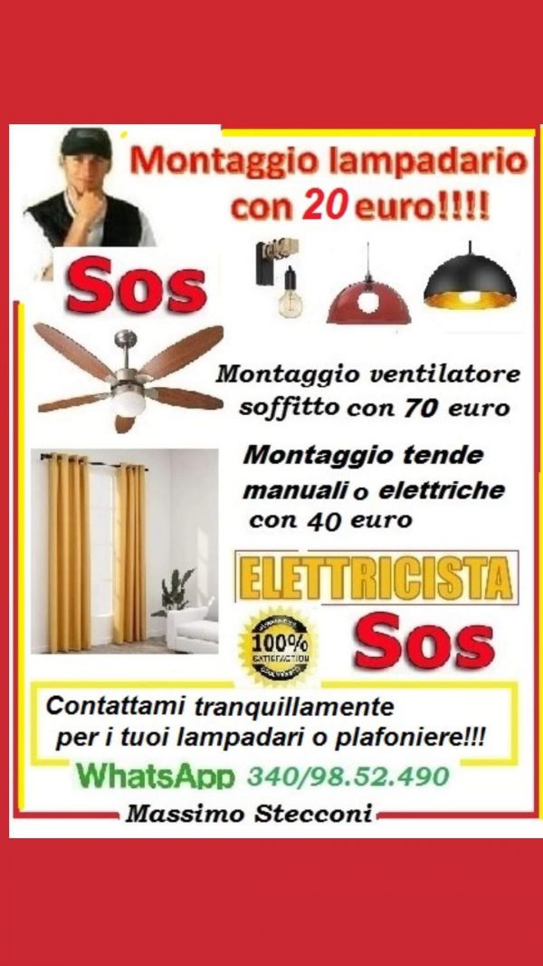 - Sono un ottimo elettricista a tua disposizione se devi montare i tuoi nuovi lampadari o applique nella tua casa. Sono specializzato in illuminazione di interni. Questo è il mio lavoro e faccio solo questo. Eseguo anche riparazioni da guasti elettrici!!! Se non vuoi perdere tempo in preventivi, sappi che il mio onorario è di 20 euro per lampadario. Ottimo come riparazione e installazione ventilatori a soffitto sia radio che con filo. Contattami tranquillamente con whatsapp per qualsiasi tua domanda o richiesta o conferma prezzi. Mi muovo su tutta Roma fino al mare. Scopri perché dico sempre .....se bene vuoi stare è me che devi chiamare!!!! Massimo Stecconi elettricista