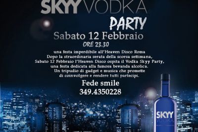 - Vodka Skyy party Sabato 12 Febbraio una festa imperdibile all’Heaven Disco Roma Dopo la straordinaria serata della scorsa settimana,Sabato 12 febbraio l’Heaven Disco ospita il Vodka Skyy Party, una festa dedicata alla famosa bevanda alcolica.Un tripudio di gadget e musica che promette di coinvolgere e rendere tutti partecipi. In consolle le sonorità dei Djs - Dj Alberto Remondini(m2o) -Dj Resident Dj Eddy Rox -Voice Roby Rossini FEDE SMILE 3494350228