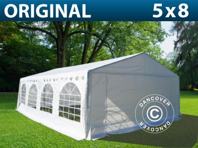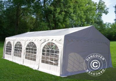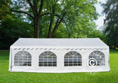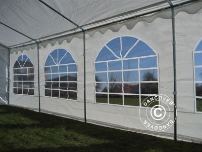 - Gazebo party di qualità in telo PVC pesante con telaio galvanizzato. Fatti di prodotto - Gazebo party popolare 5 x 8 m PVC - Ideale per 35-40 persone circa - Tubo d'acciaio galvanizzato 42 mm x 1,2 mm / 38 mm x 1,1 mm - Telo del tetto in PVC impermeabile. antifiamme 500 gr./m² - Pezzi lateriali in PVC impermeabile, antifiamme 380 gr./m² - Finestre in tutti e due i lati lunghi per una buona entrata di luce - Entrata nella parte timpano - Altezza laterale: 2 m - Altezza d'inclinazione: 2,75 m - Termine di consegna: 3-5 giorni lavorativi