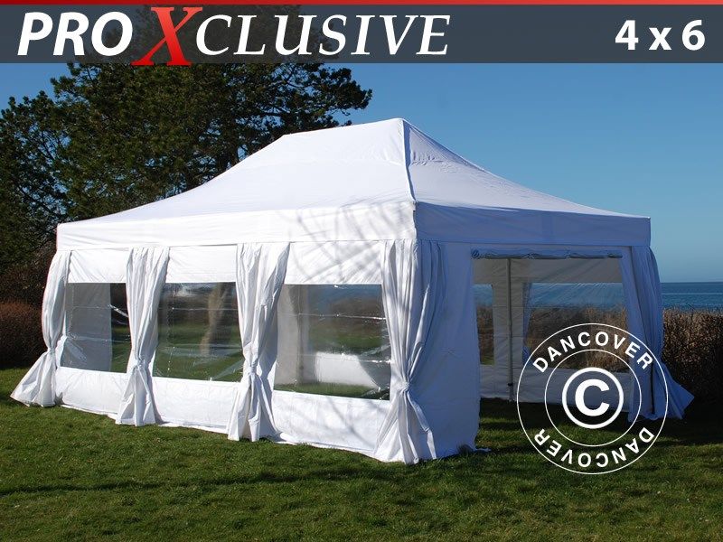 Gazebo pieghevole FleXtents PRO 4x6m Bianco, incl. 8 fianchi & tendaggi decorativi