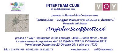 - Si svolgerà dal 16 Ottobre 2011 al 7 Gennaio 2012 la Mostra d’Arte Contemporanea “Kosmoidea - Viaggio Onirico tra Galassie e dintorni - Personale del Maestro d’Arte ANGELA SCAPPATICCI organizzata dall’Associazione di Promozione Sociale InterTeam Club in collaborazione con il “Voy Restaurant” di Roma. Nella mostra saranno presentate le più recenti creazioni d’arte pittorica dell’artista romana, fortemente ispirate ai temi dell’astrofisica e dell’arte spaziale. Il vernissage della Mostra si terrà il 23 Ottobre 2011 alle ore 17,30 presso il “VOY Restaurant ” in Via Flaminia , 496c – Ponte Milvio – Roma. ANGELA SCAPPATICCI, nata in Germania nel 1965, vive e lavora a Roma dove ha frequentato l’Istituto Statale d’Arte, specializzandosi in decorazione pittorica. Nel 1981 inizia la propria ricerca sperimentale utilizzando, nella produzione “dell’oggetto pittorico”, diversi materiali che incorpora, sovrappone o sottopone al colore.