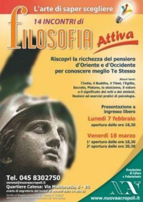 - L’associazione culturale Nuova Acropoli organizza dei corsi di filosofia rivolti a tutti coloro che si domandano il perché delle cose, per aiutarli a trovare le necessarie risposte. La prossima apertura del corso sarà in data Venerdì 18 Marzo, in doppio orario: alle 18,30 e alle 20,30. Il corso si articolerà in 14 lezioni, che si terranno con scadenza settimanale (la durata è pertanto di 4 mesi circa). La prima lezione è ad ingresso libero. Saranno trattati i principali temi della filosofia d'oriente e d'occidente, e in particolare: . l’india millenaria . la vita e gli insegnamenti del Buddha . il Tibet misterioso . l’Egitto immortale . la vita e il pensiero di Confucio . l’esempio di Socrate e Platone . lo Stoicismo di Seneca,Epitteto, Marco Aurelio . la natura e la visione ciclica della vita . esercizi pratici di Psicologia