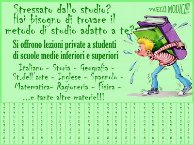 • Stressato dallo studio? Vuoi trovare il metodo di studio più adatto a te? Offresi lezioni private a studenti di scuole medie superiori e inferiori. Prezzi modici! Info: 339.50.96.782