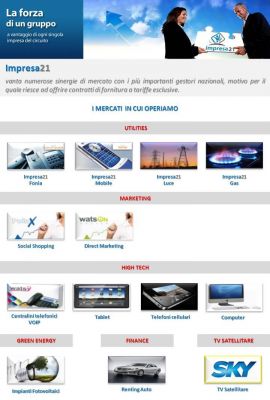 - AGENZIA IMPRESA21 Aprire un'agenzia, con investimento totalmente a carico dell’azienda, con mandato Impresa21 permette di poter distribuire al fianco di un unico partner, prodotti e servizi diversificati( telefonia fissa/mobile/adsl - energia elettrica e gas - impianti fotovoltaici - high tech - web marketing - social shoping - renting - ecc.ecc.) ed offrire così ai propri clienti, una risposta a tutte le loro principali esigenze, con il vantaggio della tariffa più bassa di mercato. Richiedi tutte le info per diventare esclusivista di zona inviando la tua candidatura a: RECRUITINGIMPRESA21@EMAIL.IT IL CONSULENTE D’IMPRESA Lavorare per Impresa21 vuol dire entrare a far parte di un progetto unico nel suo genere. Il consulente d’impresa è un libero professionista che attraverso una rete di contatti, propone ad aziende ed attività commerciali, i vantaggi gratuiti dell’adesione al circuito. I guadagni sono di sicuro interesse, vengono inoltre garantiti formazione e benefits aziendal