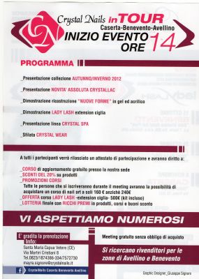 • Cristal Nails in TOUR:CASERTA-BENEVENTO-AVELLINO 15 OTTOBRE BENEVENTO presso Best Western Hotel Bei Park s.s.7 Appia,km 255,c.d.a. Epitaffio (BN) 29 OTTOBRE AVELLINO presso Hotel De La Ville Via Patalucci,20 (AV) 5 NOVEMBRE CASERTA presso Hotel Europa Via Roma,19 (CE) Meeting gratuito senza obbligo di acquisto OSPITE D'ECCEZIONE a conclusione del tour: IRENE MERLO (International Master Educator) Programma: Presentazione collezione autunno/inverno 2012 Presentazione novità assoluta crystallac Dimostrazione ricostruzione nuove forme in gel ed acrilico Dimostrazione lady lash extension ciglia Presentazione linea crystal spa Sfilata crystal wear VI ASPETTIAMO NUMEROSI E gradita la prenotazione: Santa Maria Capovetere (CE) Via Martiri Cristiani,8 Tel.0823/1874386 - 334/7572730 mayra.signore@cristalnails.it