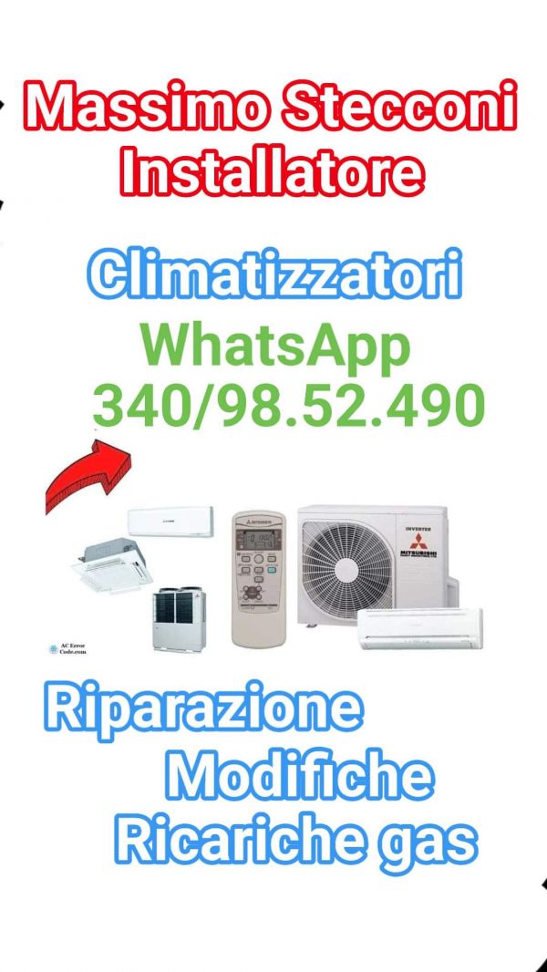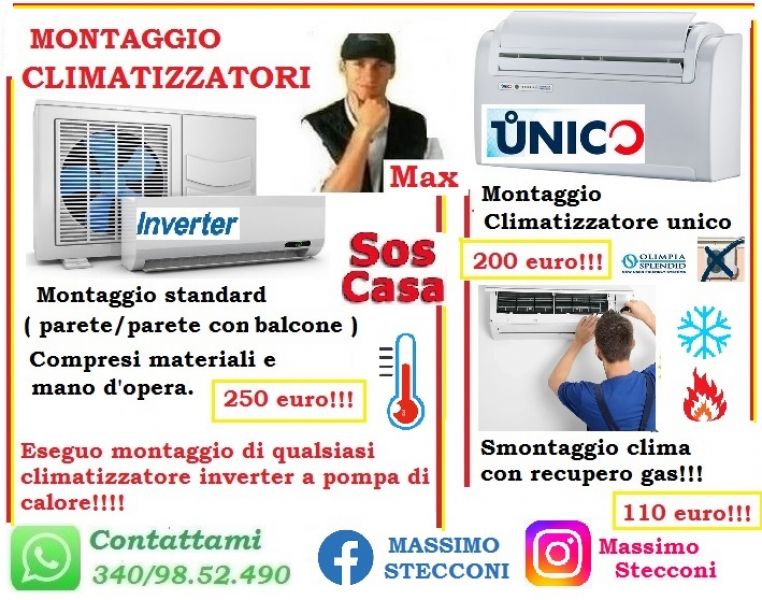 - Sono un bravo installatore di climatizzatori inverter a pompa di calore. Se hai comprato il tuo nuovo climatizzatore e non te la senti di montarlo da solo perché non è il tuo lavoro......io sono a tua disposizione!!!! Faccio questo lavoro da molto tempo. La mia manodopera per il montaggio del tuo climatizzatore è di 250 euro compresi materiali e manodopera. (Montaggio standard parete/parete con balcone o giardino. Attenzione non installo climatizzatori in facciata o sotto le finestre. Contattami tranquillamente su whatsapp per ogni tua domanda o conferma prezzi!!!! Massimo stecconi elettricista