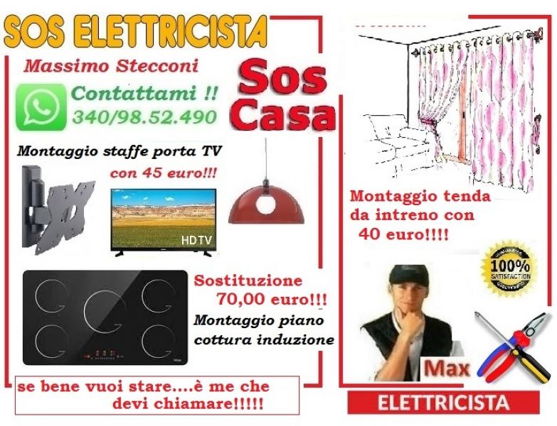- Sono un bravo elettricista specializzato nel montaggio di lampadari, plafoniere, applique, led, faretti led. Questo é il mio lavoro di sempre e faccio solo questo. Sono elettricista installatore specializzato e mi occupo anche del montaggio di ventilatori a soffitto. Le mie tariffe sono 23 euro per lampadario e se me ne fai montare dai 5 in poi il prezzo scende a 20 euro. Eseguo il montaggio di ventilatori a soffitto con telecomando radio o a filo con 70 euro. Ottimo montatore di tende da interno con solo 40 euro. Contattami tranquillamente su whatsApp per ogni tua richiesta o conferma preventivi. Se bene vuoi stare é me che devi chiamare!!! Massimo elettricista