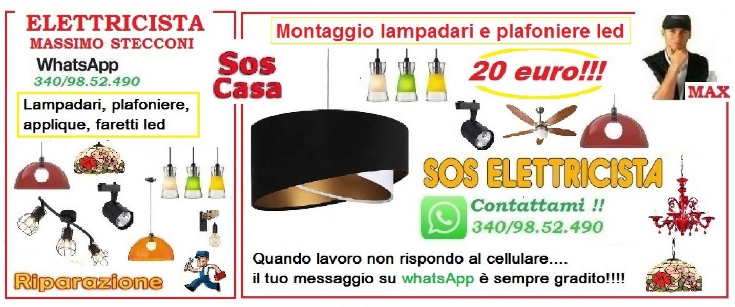 - Sono un ottimo elettricista a tua disposizione. Sono specializzato in montaggio di corpi illuminanti come lampadari, plafoniere, applique e faretti led. Il mio onorario è di 20 euro per lampadario. Non perdere tempo in inutili preventivi....con me sai subito quanto spendi. Mi muovo su tutta Roma, castelli romani fino al mare. Contattami con whatsapp per ogni tua domanda o conferma prezzi. Scopri perché dico sempre.... ...se bene vuoi fare è me che devi chiamare!!!!! Massimo stecconi elettricista