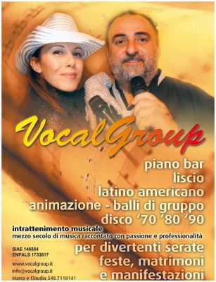 - VOCALGROUP Duo vocale specializzato in musica e animazione matrimoni, composto da Claudia e Marco. Piano-bar, pop, rock, latino-americano, liscio, balli di gruppo, disco, revival nonchè tutti i successi del momento italiani ed internazionali. Il nostro è uno spettacolo divertente ma soprattutto coinvolgente: coreografie, effetti luce, impianti audio di alta qualità e potenza, servizio karaoke e servizio Dj, animazione, giochi... La lunga esperienza, la passione per la musica e lo studio giornaliero di nuovi brani e balli, ci permette di: offrire sempre un repertorio completo ed aggiornato; offrire animazione dei nuovi balli di gruppo; essere in grado di adattarci a qualsiasi contesto. Visita il nostro sito internet dove potrai leggere i commenti di alcune delle coppie di sposi che hanno scelto noi per rallegrare il giorno delle loro nozze. Richiedici un preventivo gratuito via e-mail o contattaci al 3487118141 per ascoltarci dal vivo presso la nostra sala prove!!!