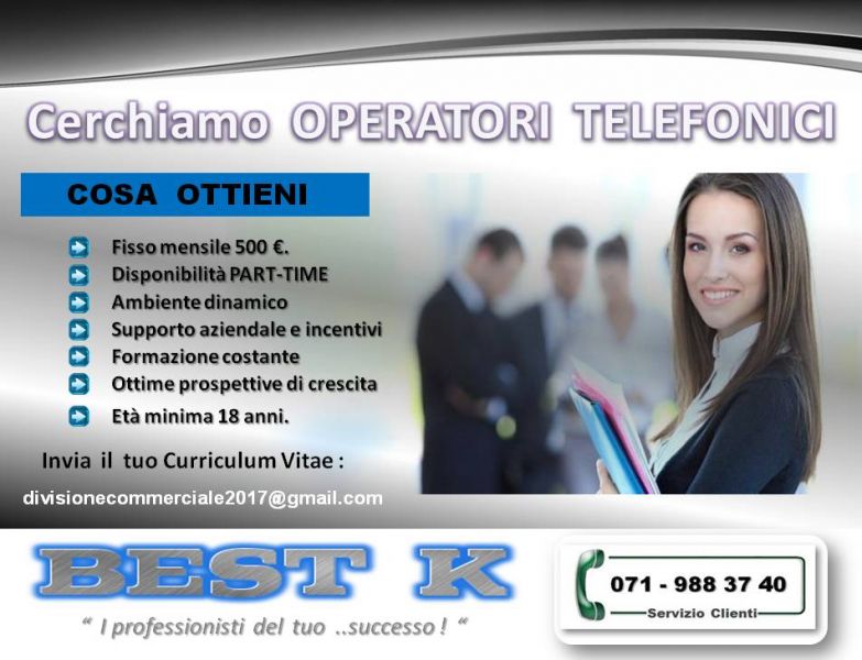 - In un ottica di potenziamento della propria rete commerciale, BEST K azienda solida cerca operatori telefonici dinamici e professionali PART -TIME con fisso mensile. I vantaggi del TELEMARKETING del Team BEST K sono innumerevoli. SEDE OPERATIVA: Il lavoro si svolgerà presso la nostra sede a SENIGALLIA. LA NOSTRA POLITICA di reclutamento si rivolge esclusivamente ad una fascia ad elevato potenziale verso i quali l’azienda BEST K investirà costantemente in termini di crescita personale e professionale. Il fisso mensile garantito più il riconoscimento remunerativo di sicuro interesse è in grado di soddisfare anche candidature esigenti. REQUISITI RICHIESTI: • Diploma scuola superiore. SI OFFRE: • Fisso mensile 500 €. La ricerca è a carattere di urgenza. AZIENDA BEST K © Info-tel: 071 - 988 37 40 Info-mail: dpsmarche@gmail.com