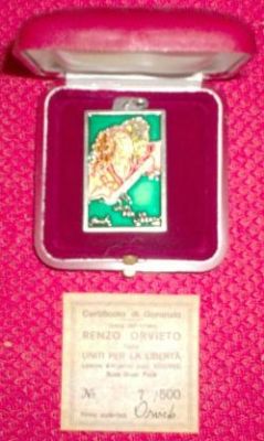 - Privato.Opera dell'artista pittore e scultore Renzo Orvieto. Certificato autentico di firma e garanzia Uniti per la libertà. Lamina argento puro. Vedi biografia in Internet