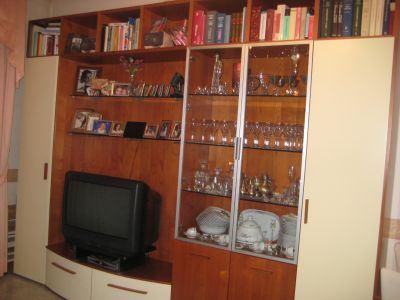 • Parete in ciliegio con ante beige completa di libreria h 2.50, lunghezza 3.30, profondita' 42cm, con vetrine e mensole vetro, vendo causa trasferimento EURO 900