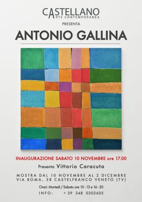- Sabato 10 novembre alle ore 17, la Galleria Castellano Arte Contemporanea (Via Roma, 38, Castelfranco Veneto TV), inaugura la personale di Antonio Gallina. L’artista collabora con la Galleria dal 2010 e da questa è stato presentato con grande successo, ad Affordable Art Fair di Roma lo scorso 25/28 ottobre. La mostra non ha un titolo, così come le sue opere, perché il suo vocabolario è assolutamente senza artifici, il suo dentro è immediatamente proiettato sulla tela. Antonio Gallina sarà presentato dal Prof. Vittorio Caracuta che, come critico d’arte, lo segue già da un paio d’anni. L’esposizione rimarrà aperta fino a domenica 2 dicembre compresa. Brochure a cura di Tommaso Gallina. Orari Martedì/sabato: ore 10 -13 e 16 – 20 Domenica 2 dicembre 2012 ore 16 – 20 Info: www.castellanoartecotemporanea.com mail: castellanoartecontemporanea.com