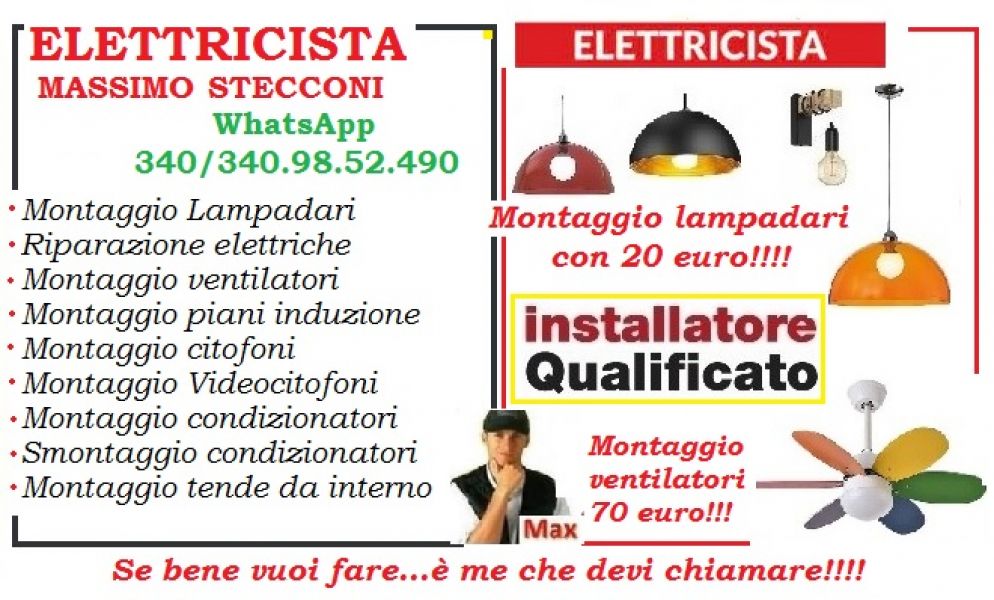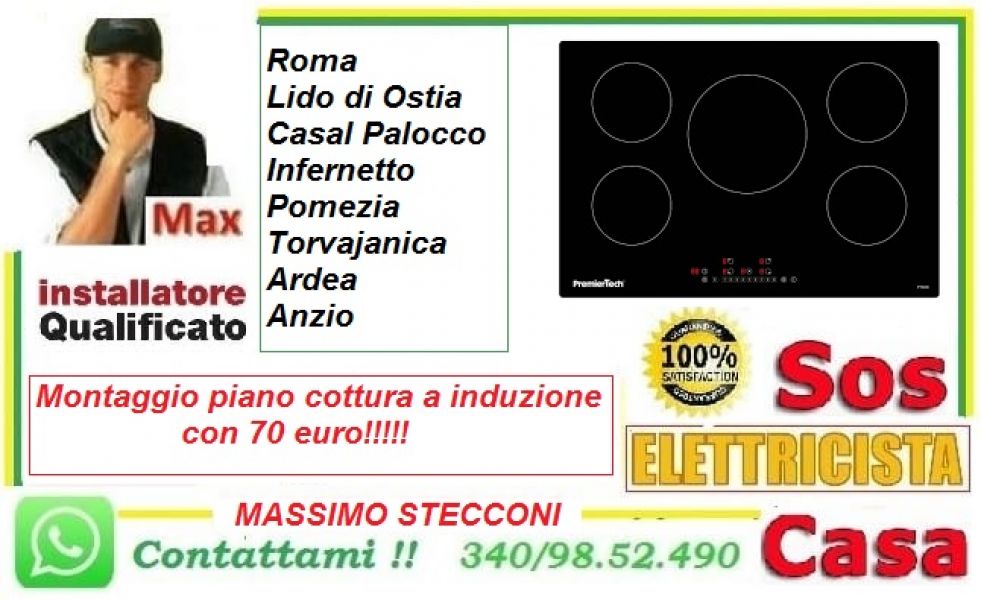 - Sono un bravo elettricista a tua disposizione se hai comprato il tuo nuovo piano induzione al posto dei fornelli a gas. Installo con collegamenti elettrici il tuo piano induzione con manodopera di 70 euro. Sono serio e competente. Mi muovo su tutta Roma fino al Mare!!!! Contattami tranquillamente su whatsapp per ogni tua domanda o conferma prezzi!!!! Se bene vuoi stare è me che devi chiamare!!! Massimo stecconi elettricista
