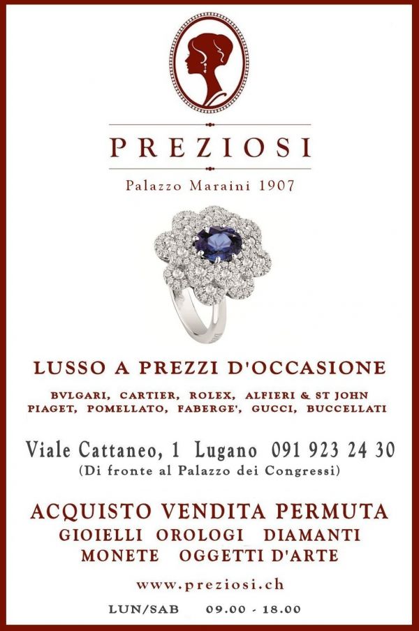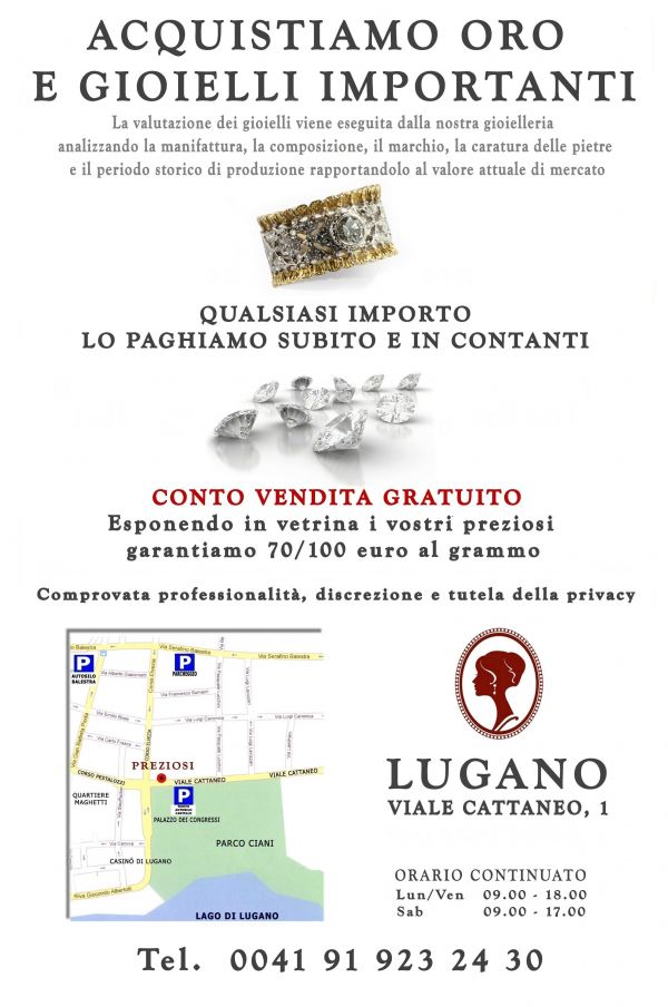 - Siamo alla ricerca di gioielli antichi in oro, diamanti e pietre di colore; orologi di marca e diamanti. Nella splendida cornice di Lugano, nello storico Palazzo Maraini troverete una suggestiva gioielleria d’altri tempi con un gusto articolare per gli oggetti preziosi: gioielli nuovi e d’epoca, orologi, rarità ed oggetti d’arte. Grazie alla provata esperienza nel settore è diventata negli anni un punto di riferimento per la compravendita internazionale di preziosi ed oggetti da collezione. Contattateci o venite a trovarci, saremo a Vostra disposizione